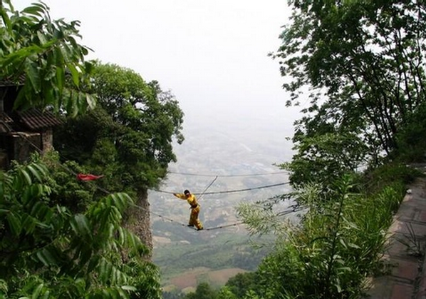 峰由上下两根铁索组成悬桥相连。峰下不远处为云岩寺,始建于唐,明末焚于兵火,清雍正三年
